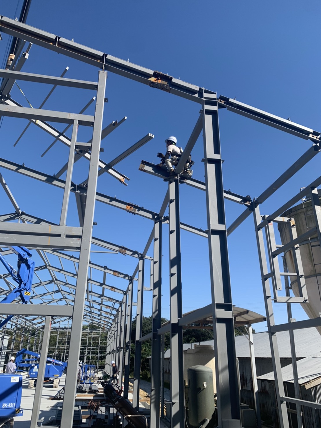 今回の鉄骨建方は、養鶏場の建方になります。安全仮設がなしとなっており、高所作業車を使用しての作業となりました。